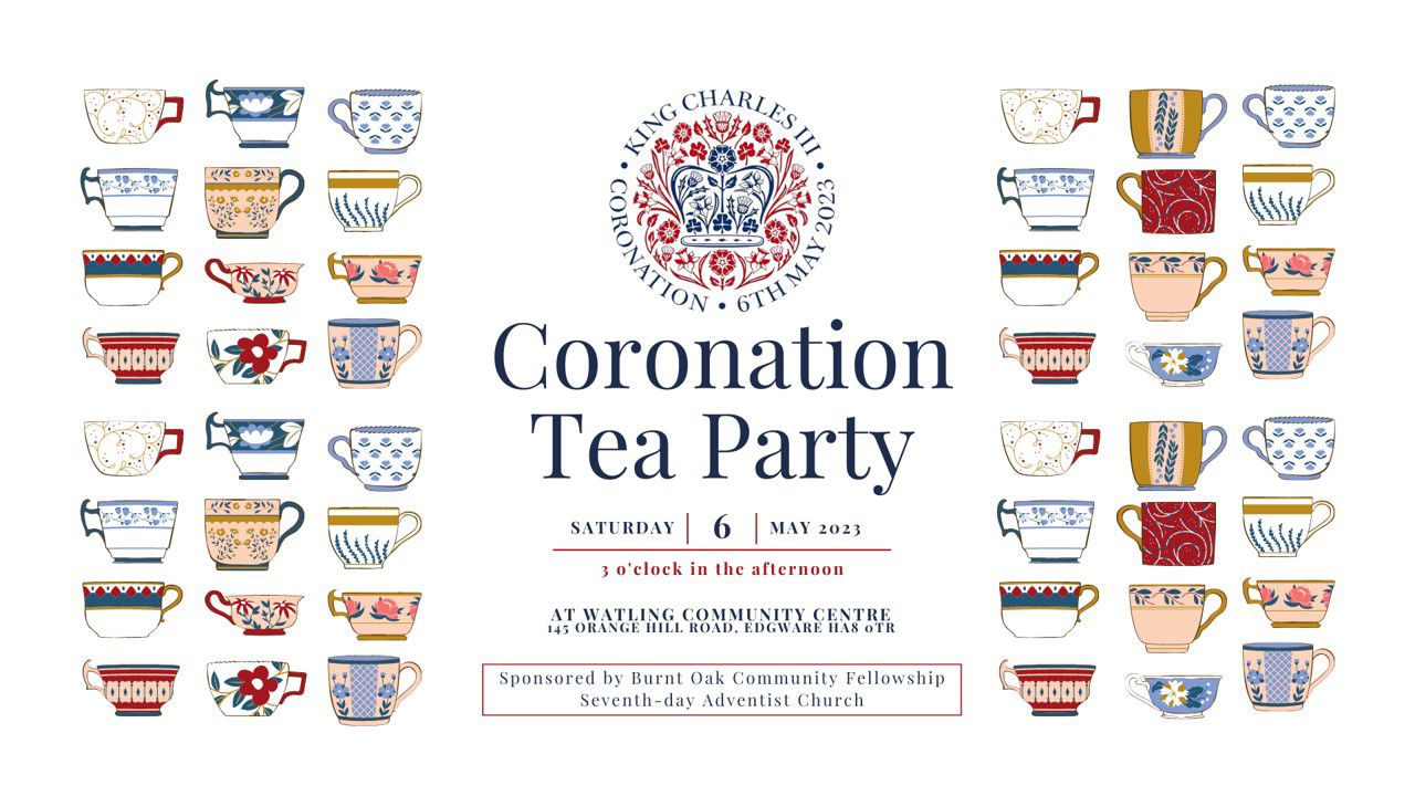 On Saturday, May 6, 2023, from 3 PM onwards, we'll be hosting a Coronation Tea Party sponsored by Burnt Oak Community Fellowship Seventh-day Adventist Church.